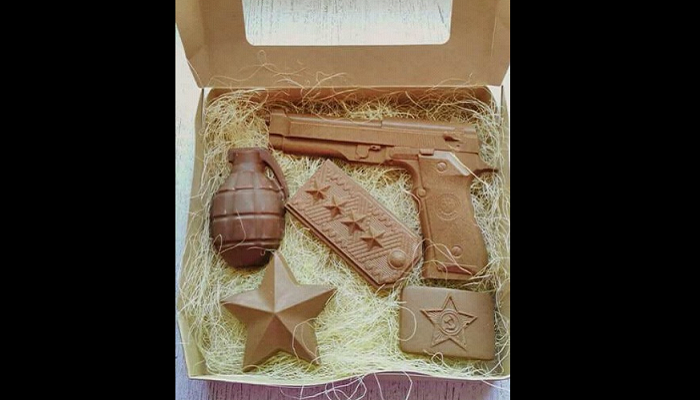 "Оригинальный, веселый и очень вкусный подарок для настоящих мужчин", - заявляют на кондитерской фабрике, выпустившей "уникальный подарок" к Дню Победы.