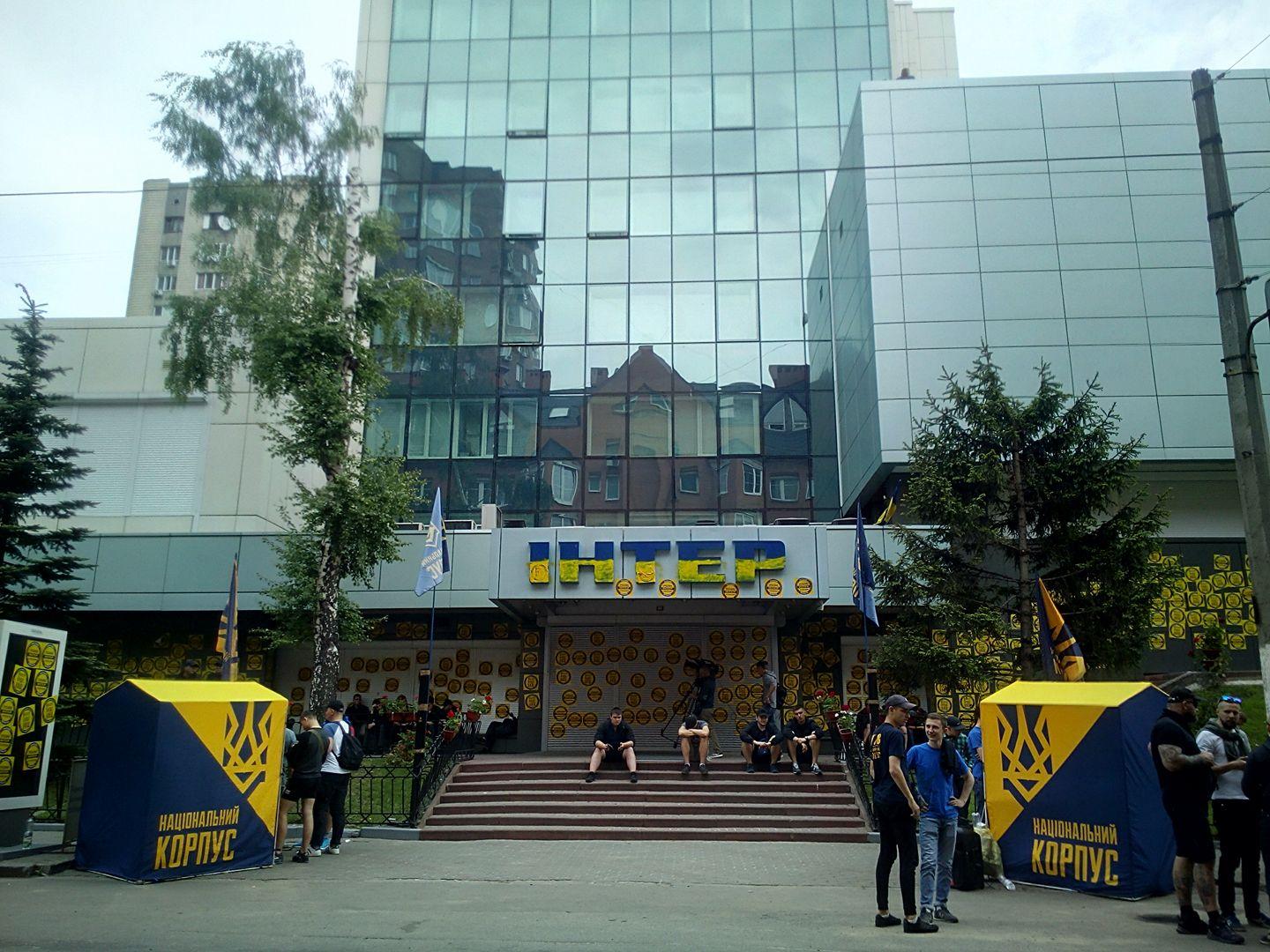 Кроме того, участники акции протеста обклеили все стены офиса листовками. У здания телеканала "Интер" дежурит полиция Киева.