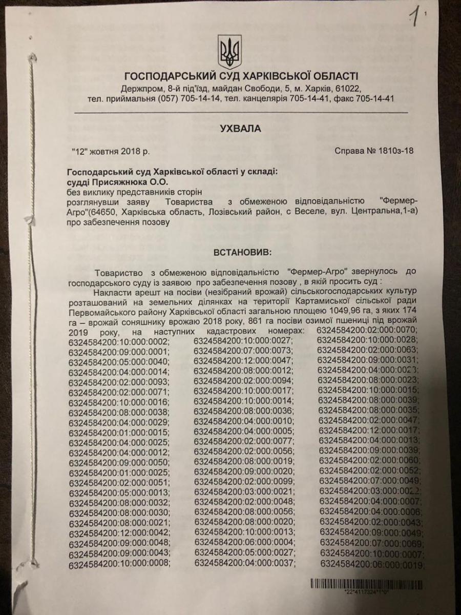 Тож саме з метою недопущення порушення законних прав селян та задля збереження врожаю та посівів ТОВ «ФЕРМЕР-АГРО» та ТОВ «ЩЕДРІ ЛАНИ СЛОБОЖАНЩИНИ» звернулися до Господарського суду Харківської області з заявою про забезпечення позову, яка й була задоволена ухвалою від 12 жовтня 2018 року.