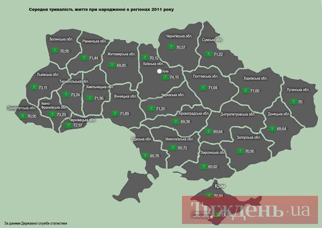 За последние пять лет показатели средней продолжительности жизни высокие в Киеве (72,66), Тернопольской (72,1), Черновицкой (71,85), Львовской (71,76), Ивано-Франковской (71,75) областях.