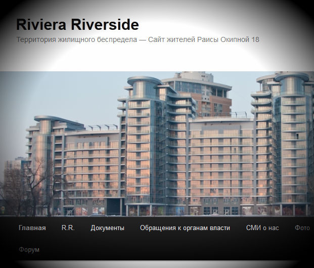 Название сайта, на котором размещен форум «Riviera Riverside. Территория жилищного беспредела — Сайт жителей Раисы Окипной 18». Здесь жители дома по адресу ул. Раисы Окипной, 18, которые создали инициативную группу, обсуждали внутренние проблемы дома.