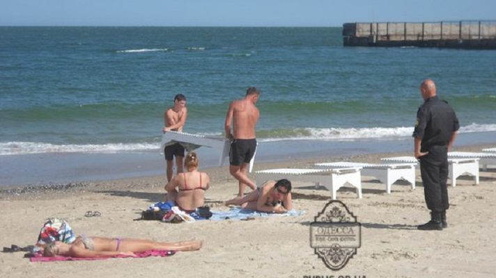 Однако появившиеся мужчины с автоматами потребовали от людей покинуть территорию пляжа. После этого стали выносить и раскладывать на пляже шезлонги.
