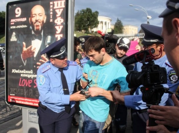 Мужчина начал отбиваться от участников митинга, толкать их руками и прикидываться пьяным. Митингующие вначале пытались самостоятельно оттащить мужчину, потом позвали милицию. Милиционеры взяли его под руки и отвели в сторону.