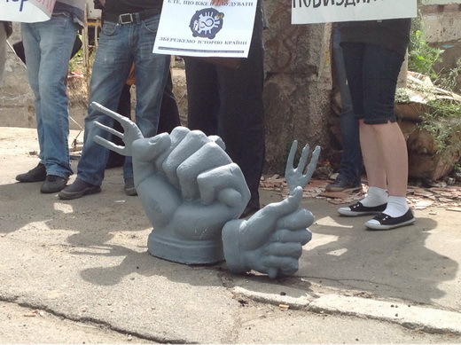 Памятник Дерибану - это большой кулак, держащий вилку, которой, по словам защитников Десятинного переулка, "дерибанят исторические земли Киева".
