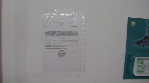 Приказ ДУМК № 122 на стене мечети в Белогорске. Фото: А. Диденко