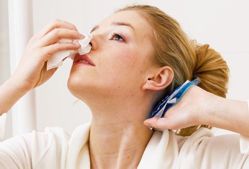 Чтобы остановить носовое кровотечение, сядьте и голову слегка опустите вниз. Запрокидывать ее нельзя. Если кровь попадет в носоглотку, можно захлебнуться. К переносице приложите лед или холодную примочку: от холода сосуды суживаются, и носовое кровотечение постепенно останавливается.