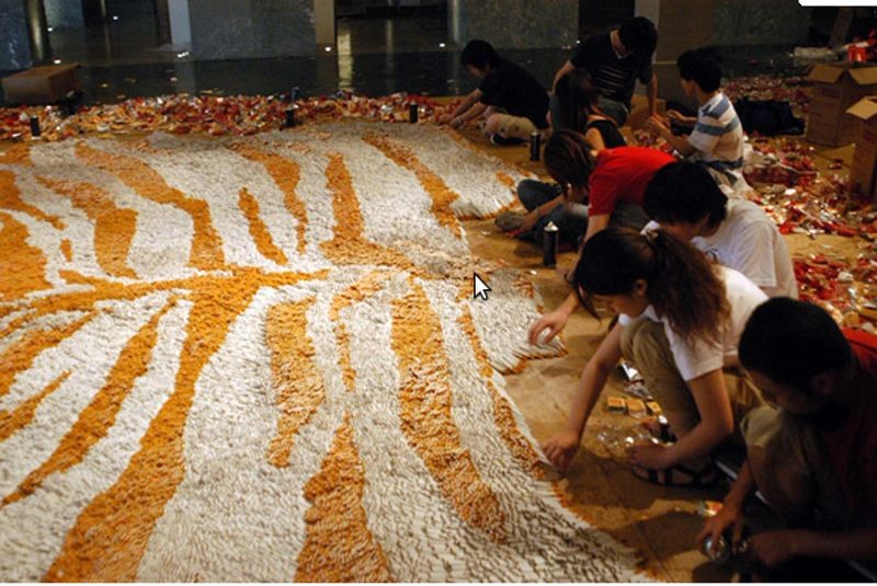 Знаменитый художник и дизайнер Сюй Бин сделал невероятный ковер, который выглядит, как шкура тигра. Впрочем, ни художнику, ни поставщикам материала для создания ковра не нужно было убивать это редчайшее животное. Понадобилось купить 500 тысяч сигарет, из которых и создали ковер.