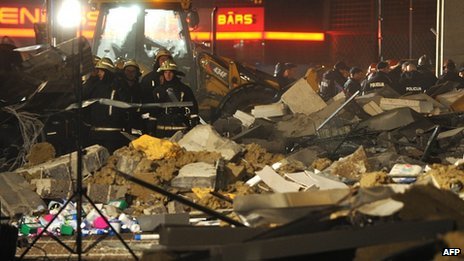 На месте трагедии спасатели продолжают работу на пяти участках. Три группы работают на уровне первого этажа, одна с помощью автопогрузчика старается разрезать более легкие конструкции крыши. Пятая группа работает в подвале здания.