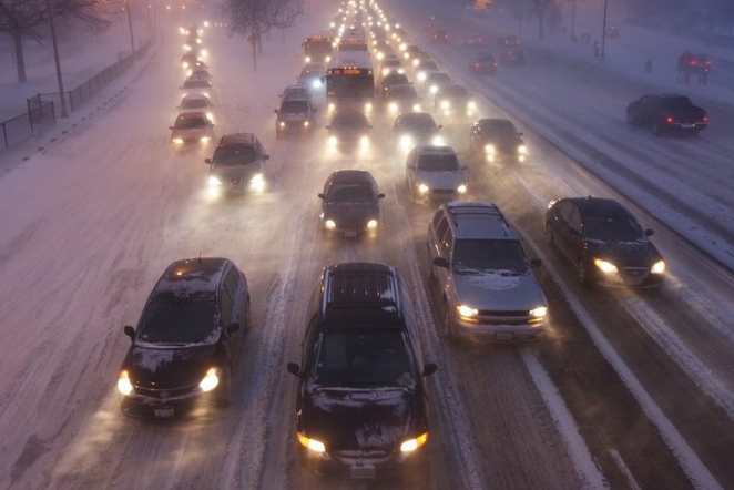 Проезд автомобилей затрудняет сильный снег, начавшийся еще затемна, из-за чего скорость движения не превышает 20-30 км/ч. Помимо того, проблемы создает и полностью перекрытый правительственный квартал.