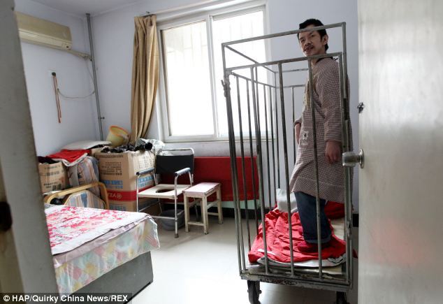 В детстве ныне 48-летний Пэн Вэйкинг постоянно падал, разбивая себе в кровь лицо, и резал себя осколками битого стекла. Чтобы мальчик не смог причинить себе боль, мать заперла его в клетке. По мере того, как ребенок рос, женщина вместе с мужем сооружала для Вэйкинга все новые и новые вольеры. По словам женщины, сын ее узнает, однако даже не может произнести слова "мать". Ему необходима защита, считает она.