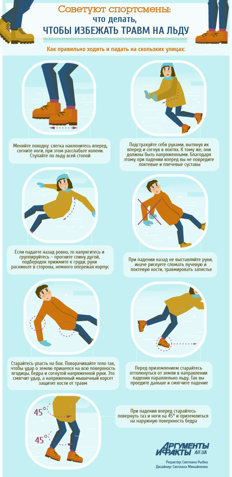 Медики советуют подготовиться к ледяной погоде заблаговременно: принимать препараты с кальцием, ходить в обуви на резиновой или рифленой подошве и записаться в спортивную секцию, чтобы укрепиться физически. Особенно полезно заниматься борьбой или фигурным катанием – в этих видах спорта отрабатывают падения, как важный элемент тренировок.