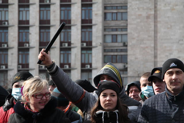 Милиционеры, которые обеспечивали порядок в Донецке 23 февраля, где одновременно проходили митинги сторонников и противников евроинтеграции Украины, уговаривали некоторых активистов успокоиться. Донецкая милиция успокаивала митингующих с вилами против Евромайдана.