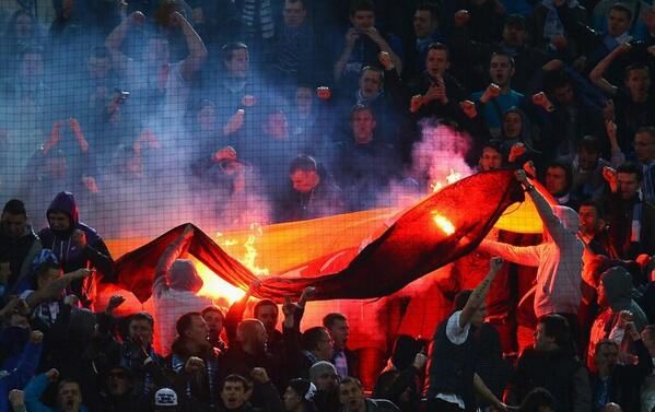 Во втором тайме фанаты питерской команды сожгли по некоторым сообщениям флаг немецкого клуба, по другим – флаг Германии.