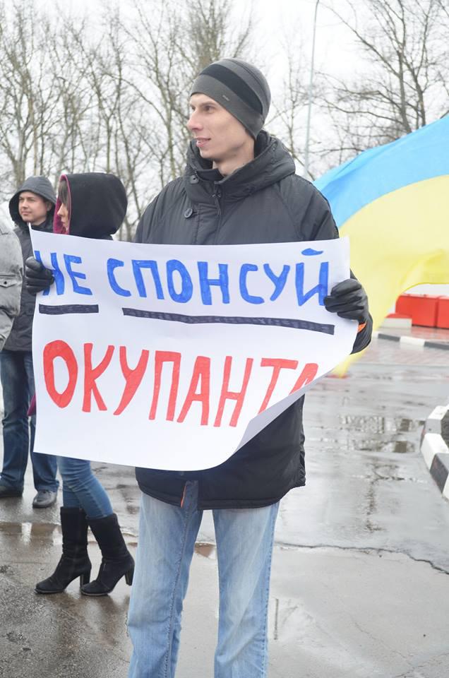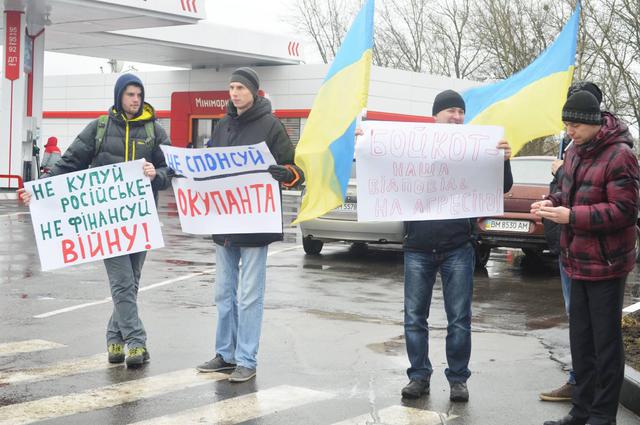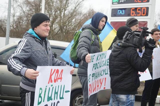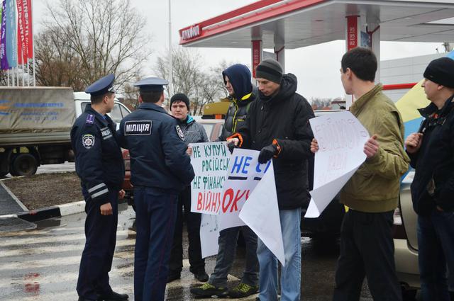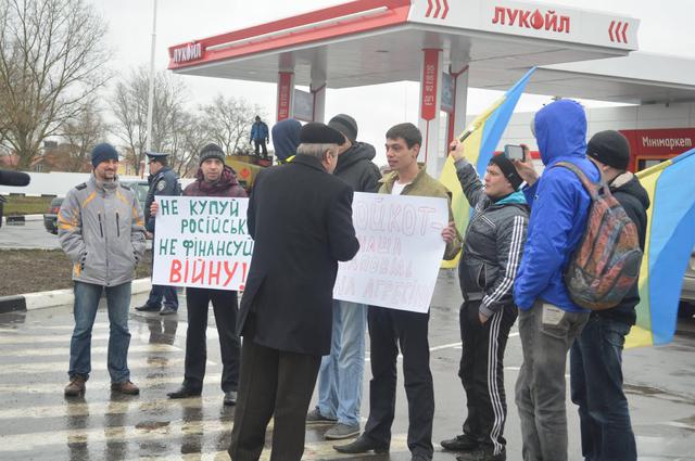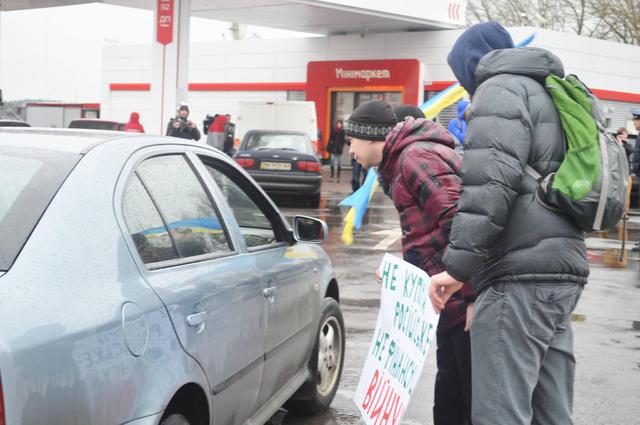 С украинскими флагами и плакатами протестующие пикетировали один из бензозаправочных пунктов российской компании «Лукойл».