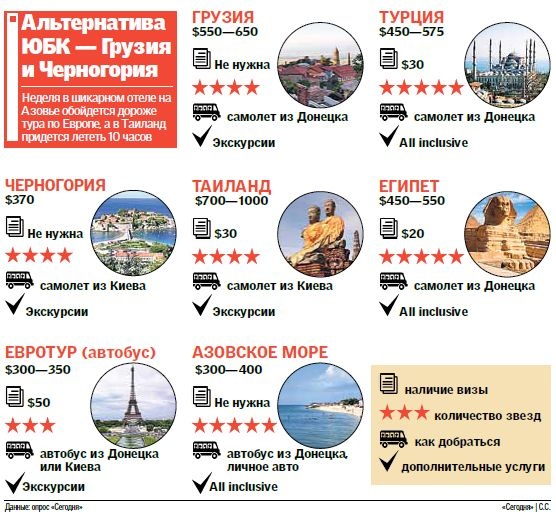 Дончанам, которые привыкли отдыхать на пляжах ЮБК, в агентствах предлагают массу сопоставимых по бюджету альтернативных вариантов за границей: в Турции, Хорватии, Черногории, Грузии и других странах. «Сейчас для наших туристов очень привлекательны страны, которые входят в шенгенскую зону и упростили процедуру получения виз. Отдых за границей обойдется немногим дороже, нежели в Крыму, а то и дешевле. Например, в Турции или Египте, где отдых стартует от $450 с человека. За эти деньги мы предлагаем на неделю пятизвездочный отель, несколько экскурсий на выбор, ежедневную развлекательную программу и трехразовое питание», — рассказала нам менеджер туроператора Кристина Ткаченко.