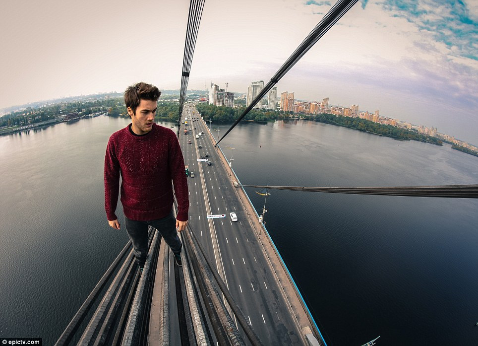 Кингстон, известный любовью к вышкам и мостам, на этот раз приехал в Киев и забрался вместе с другом по прозвищу Mustang Wanted на самый верх Московского моста, высота пилонов которого равняется 119 м.