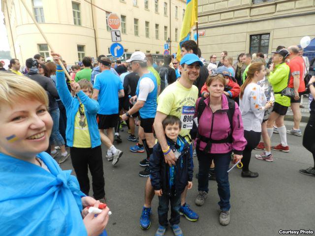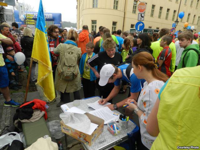 В Праге часть участников международного полумарафона надели на руки желто-голубые ленты в знак протеста против оккупации Крыма.