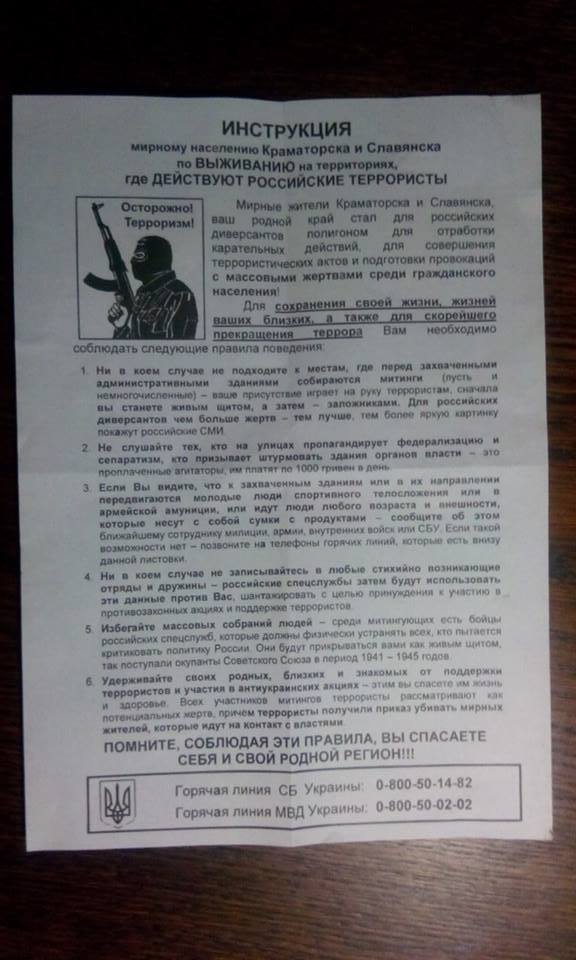 В Славянске во время антитеррористической операции МВД распространяло листовки с инструкцией по "выживанию на территориях, где действуют российские террористы".