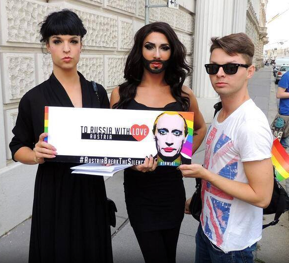 В сети опубликовано фото Кончиты Вурст с плакатом, на котором президент РФ нарисован на фоне флага ЛГБТ-сообщества.