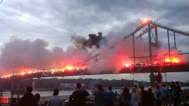 Весь мост запылал красным пламенем, а над Днепром звучало "Путин - х*йло". Ультрас также устроили патриотическую перекличку "Слава Украине! Героям слава!" и "Вива, вива, Украина!".
