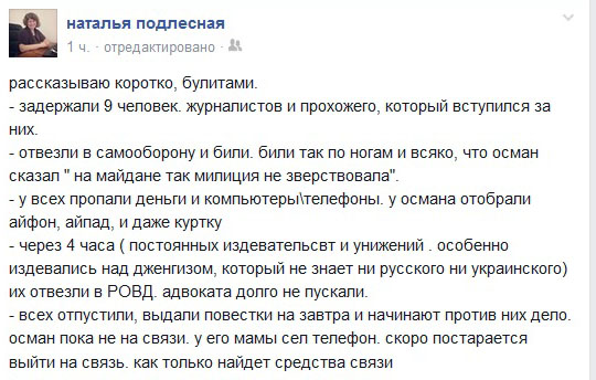 "Задержали девять человек. Журналистов и прохожего, который вступился за них. Отвезли в самооборону и били… что Осман сказал "на Майдане так милиция не зверствовала". У всех пропали деньги и компьютеры/телефоны. У Османа отобрали айфон, айпад, и даже куртку", - написала Подлесная.