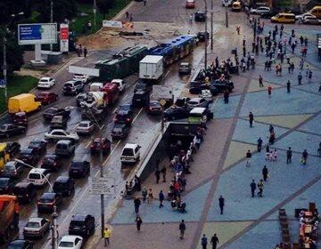 Из-за пропасти на площади образовался затор из автомобилей и общественного транспорта. Провал образовался из-за прорыва теплосети "Киевэнерго". Именно их работники должны устранить последствия прорыва.