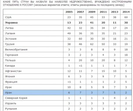 Так, на вопрос: "Какие пять стран вы назвали бы наиболее недружественно, враждебно настроенными по отношению к России?", 69% россиян назвали США, 30% - Украина, Литву - 24%, Латвию - 23%, Эстонию - 21%, Грузию - 19%.