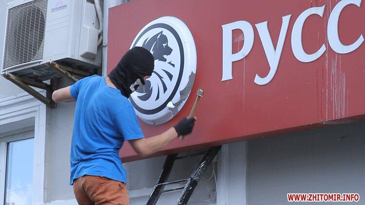 Первым пострадал "Сбербанк России", пишет Житомир.info. Затем активисты направились к банку "Русский стандарт". Сокрушив вывеску и оставив несколько надписей на фасаде "Рассія, go home!" и "Водки нет!", люди поехали к "ВТБ". Там тоже повредили вывеску и исписали фасад.
