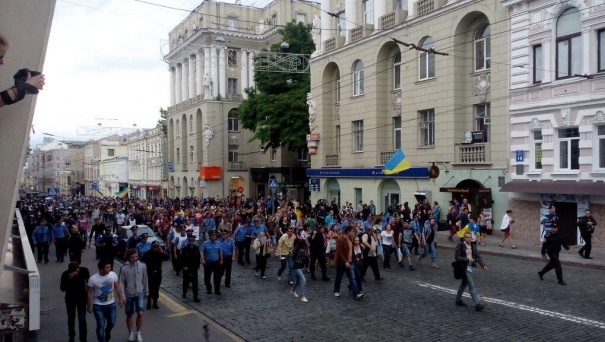 Напомним, что в воскресенье вечером, 22 июня, около 1000 харьковских патриотов под флагами Украины прошли колонной по улице Сумской от памятника Шевченко до пл. Конституции. Активисты несли в руках плакаты с надписями "Кремль - паук", выкрикивая "Слава Украине!", "Смерть врагам!".