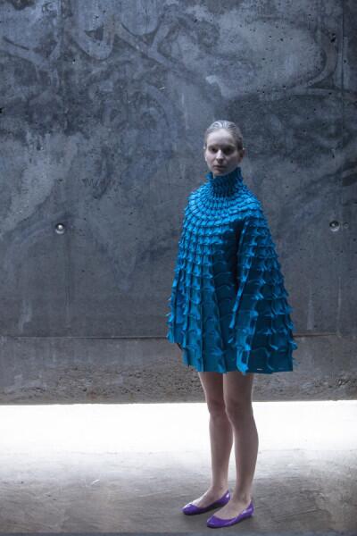 Для изготовления каждого платья дизайнер использовала цельный материал, который она предварительно с помощью лазера нарезала на мелкие кусочки, после чего скрепляла между собой, создавая тем самым объемную фактуру.