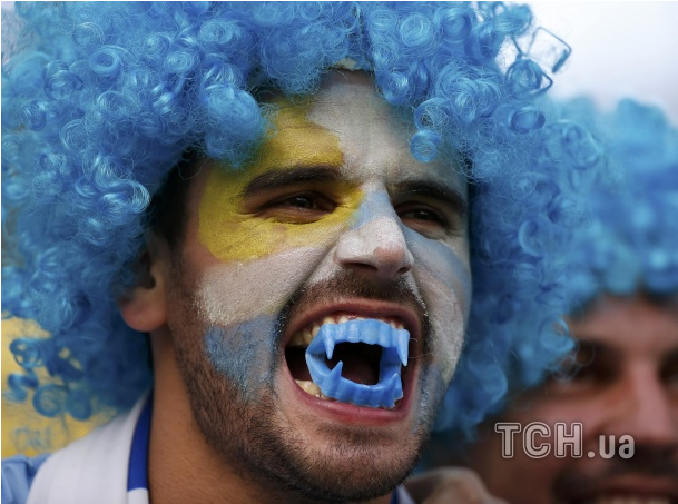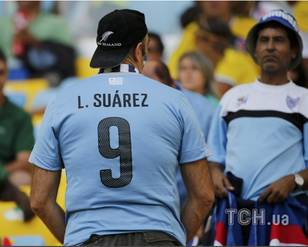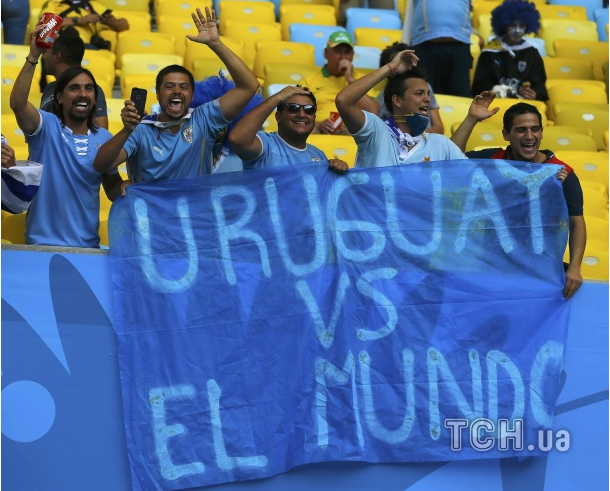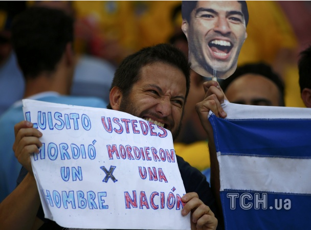 Также болельщики принесли плакаты с надписями "Уругвай, зубами и когтями", "Уругвай против мира" и "Луис, мы укусим Бразилию за тебя".