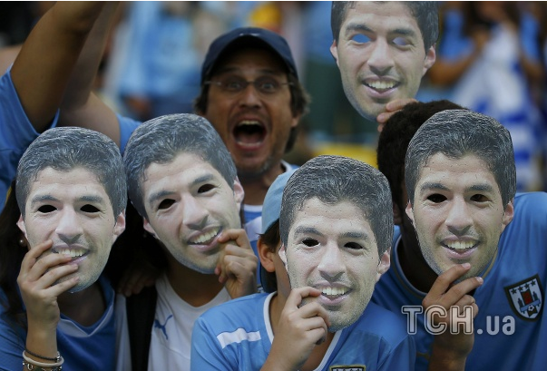 Уругвайцы пришли на матч с фотографиями Суареса и кусают друг друга.