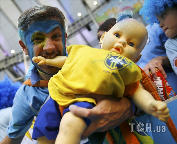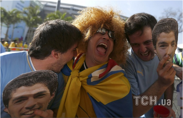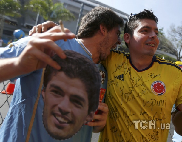 Уругвайцы пришли на трибуны "Мараканы" с фотографиями Суареса и кусают друг друга, позируя перед фотокамерами.