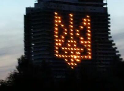 Герб, что горит, появился на недостроенной гостиницы "Парус", которая расположена на набережной в центре города Днепропетровска и заметна из многих жилых массивов. Еще в мае огромный трезубец на фасаде нарисовали футбольные фанаты. После чего он мгновенно стал популярной достопримечательностью Днепропетровска.