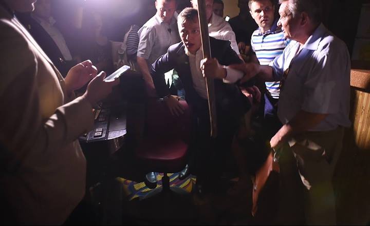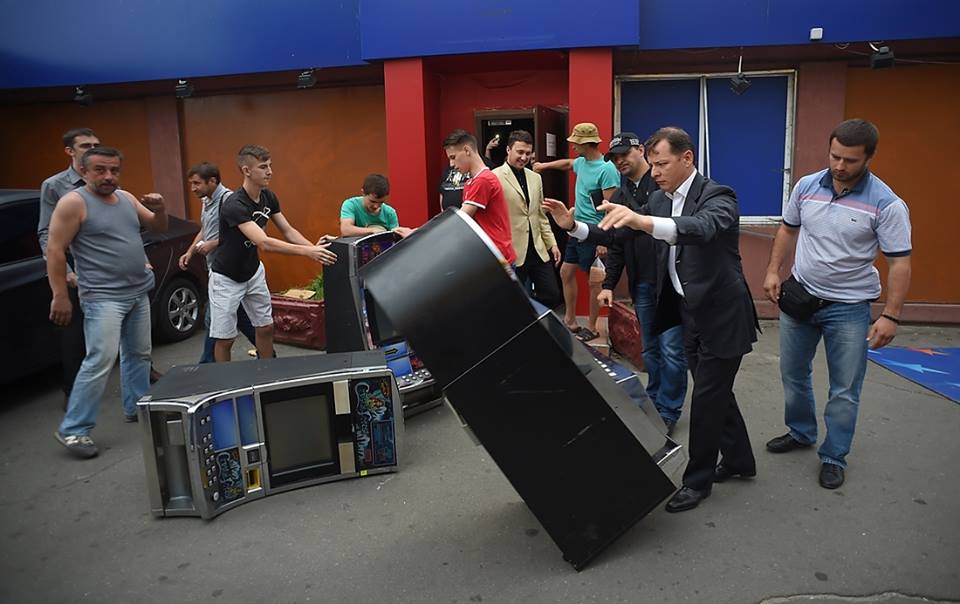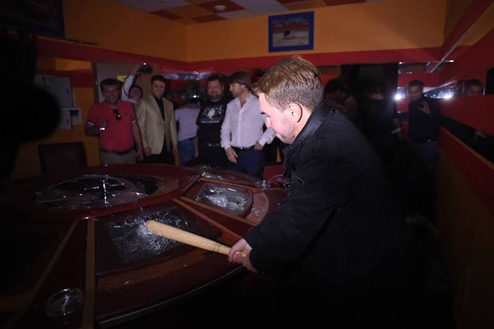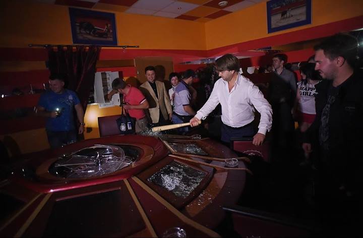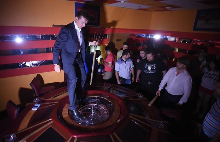 Ляшко традиционно пришел на акцию с вилами. Игровые автоматы он крушил битой, а потом вылез на игровой стол с рулеткой и топтался по нему ногами.