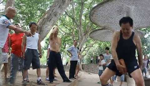 70-летний житель Китая практикует крайне странную дисциплину, долбя себя в промежность молотком, металлической гирькой и кирпичом. При этом, пока он бомбардирует свои "стальные шары", он не издает ни звука.