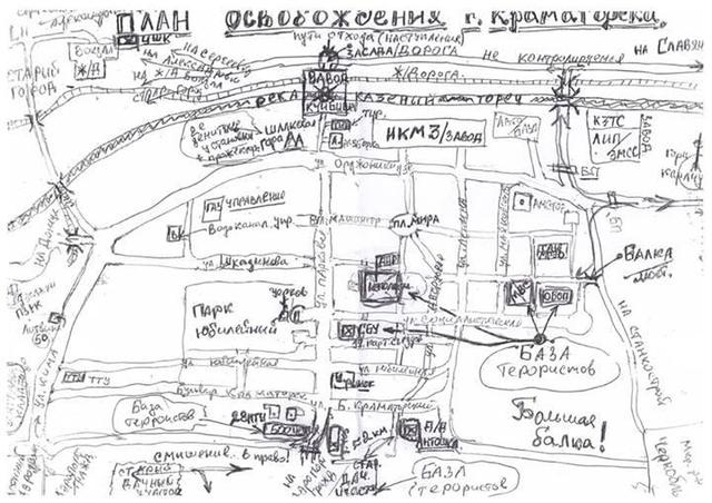 Жители Краматорска, уже освобожденного украинскими силовиками от террористов, во время контроля города боевиками оказывали содействие силам АТО. Разведке сообщали о местах расположения боевиков, фиксировали их на самодельных картах. Об этом на своей странице в Facebook сообщил журналист Артем Шевченко и опубликовал фотографию одной из таких карт.