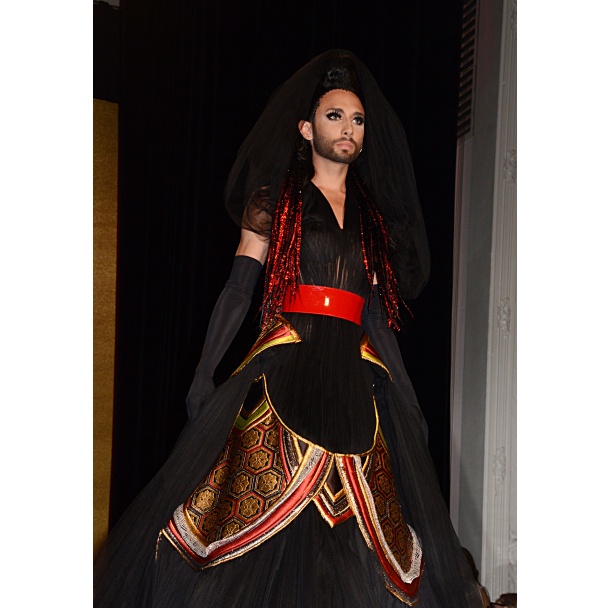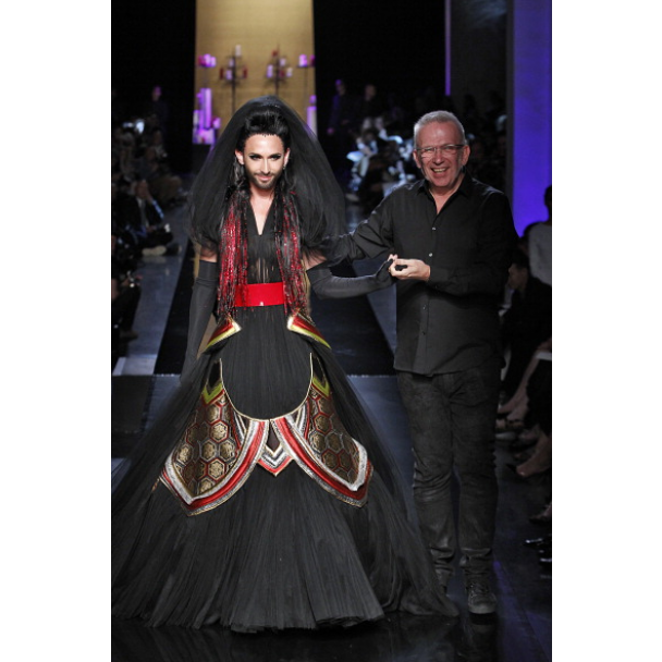 На этот раз известный дизайнер Жань-Поль Готє предложил Кончите продефилировать в шикарном черном свадебном платье. Конечно же, артистка не смогла отказать знаменитому кутюрье.