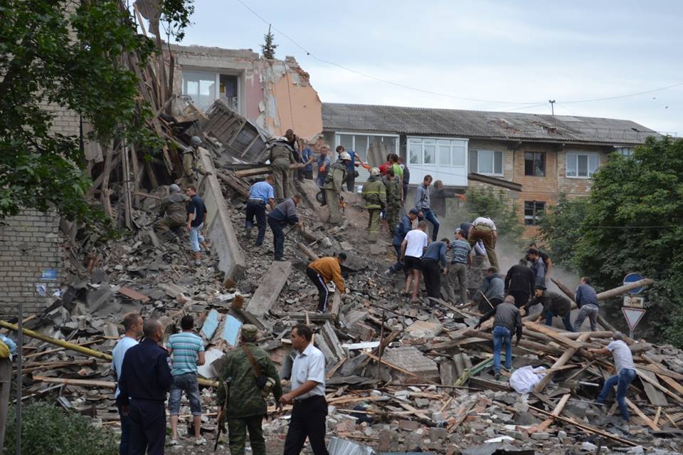 В результате обстрела полностью разрушено здание налоговой инспекции, также разрушены 5-этажный дом, есть погибшие и раненые.