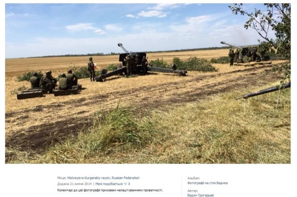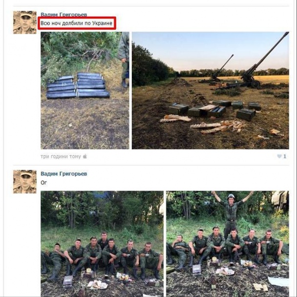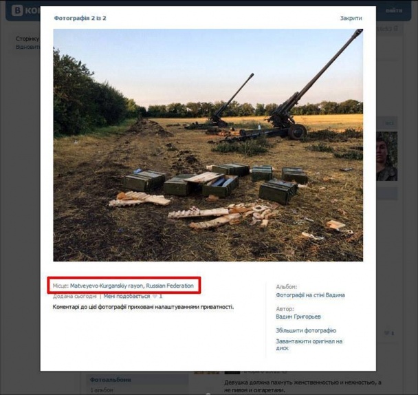 Кроме того, Григорьев сфотографировал товарищей по службе и боевые орудия, которые обстреливают украинских военных и мирное население по ту сторону границы, а на опубликованных фото указал район Ростовской области России, из которого, по сути, и обстреливают украинских военных.