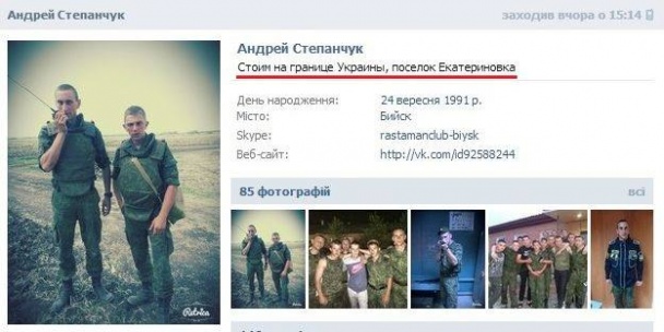 Тем временем, еще один российский солдат из города Бийска Андрей Степанчук на своей странице в "ВК" в своем статусе написал следующее: "Стоим на границе Украины, поселок Екатериновка", а также опубликовал фото своего военного билета, который подтверждает, что солдат действительно из российского города Бийска.