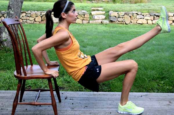 Спиной поворачиваемся к стулу, руки расположены на краю сидения стула, ноги вытягиваем вперед, упор должен быть на пятки. Стараемся держать ягодицы на расстоянии от сидения. Опускаемся, сгибая руки на 90 градусов. Возвращаемся в исходную позицию.