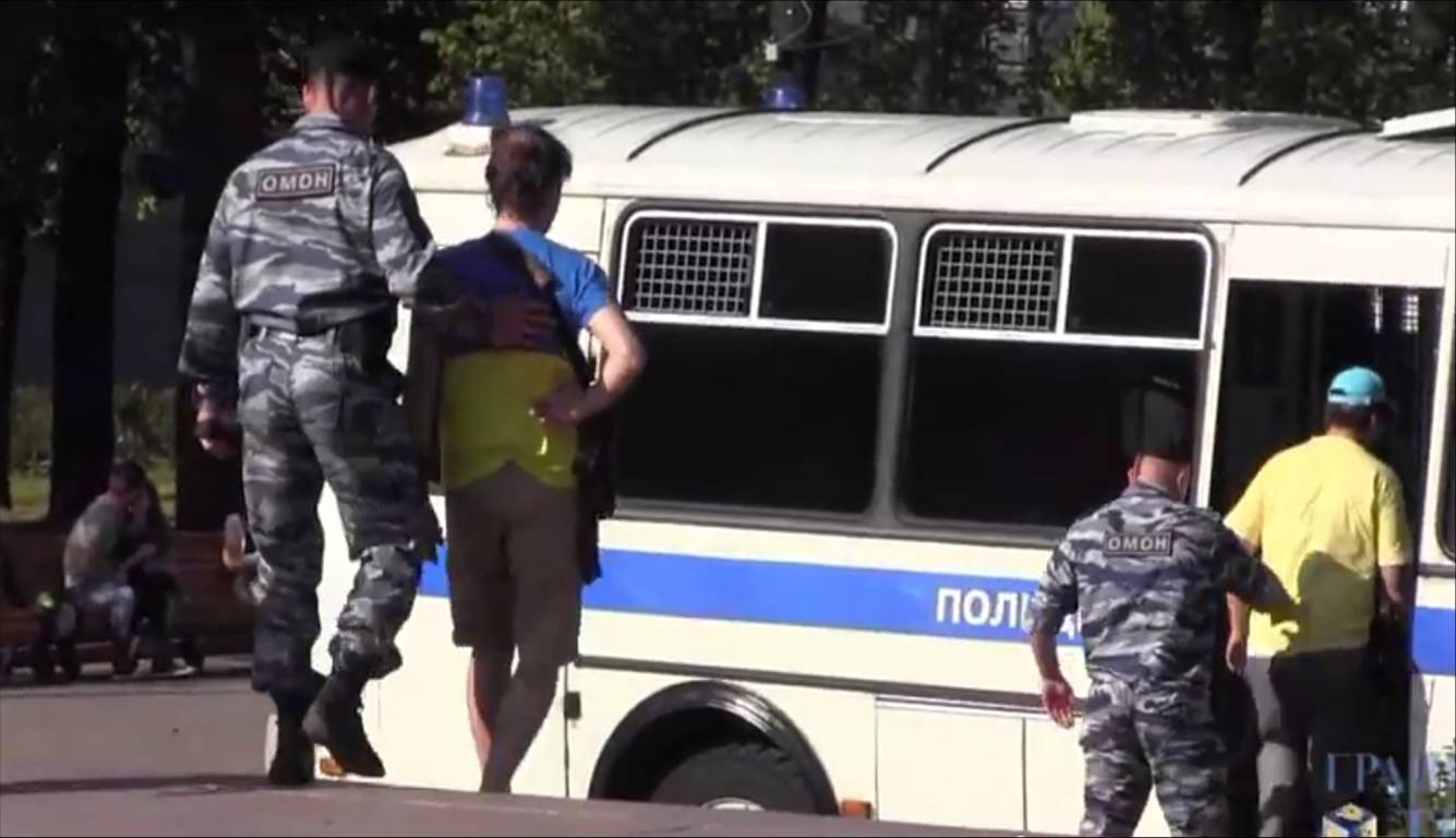 Как сообщает российское издание "Грани.Ру", около 20 активистов с украинской национальной символикой планировали устроить прогулку в поддержку Украины по центральным улицам Москвы, однако сотрудники ОМОНа не дали им этого сделать и сразу же начала задерживать людей в одежде цвета украинского флага.
