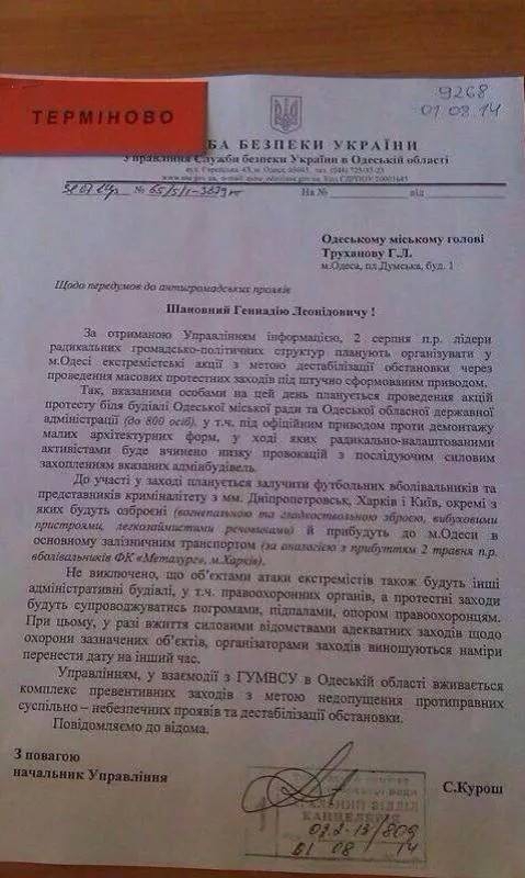 Завтра, 2 августа, в Одессе могут повториться погромы с жертвами, имевшие место 2 мая этого года. Это вытекает из документа от УСБУ в Одесской области мэру Одессы Геннадию Труханову.