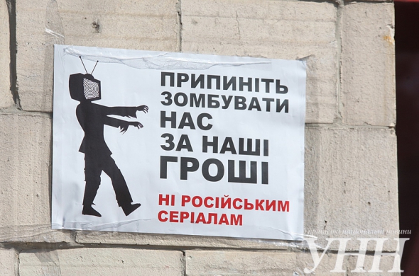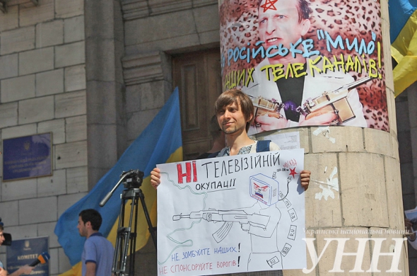Около десятка активистов в очередной раз пришли под стены Национального совета по вопросам телевидения и радиовещания, где требовали у руководства учреждения повлиять на то, чтобы с украинского теле- и радио- пространства был полностью исключен российский контент.
