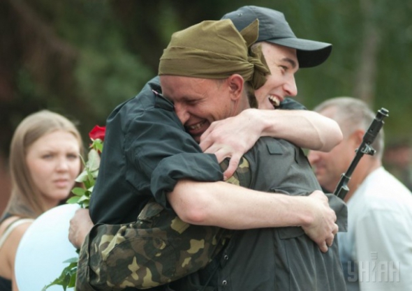 Из зоны АТО вернулось 45 бойцов спецподразделения "Гепард". Военных встречали родные на территории военной части №3029. Родственники участников АТО принесли цветы и хлеб своим мужьям, родителям.