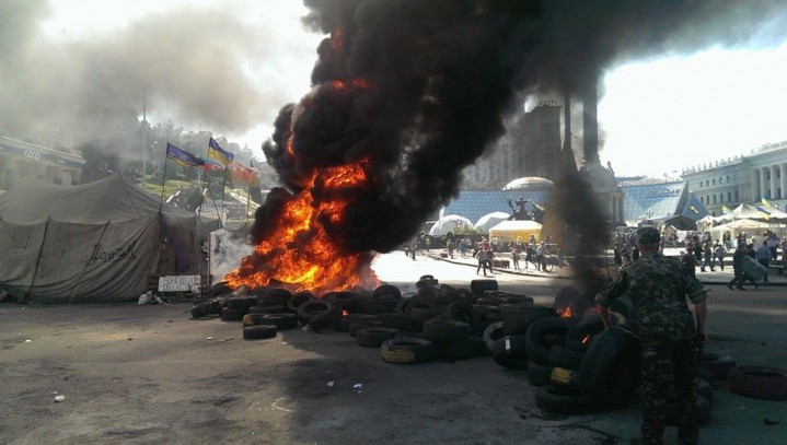 Столичные власти разбирают баррикады на Майдане по улице Крещатик, а протестующие в знак протеста поджигают шины. Об это сообщают очевидцы в соцсетях.