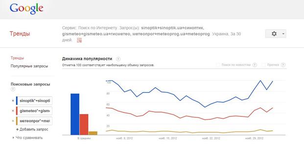 По статистике «Тренды Google» SINOPTIK.ua также существенно опережает другие погодные сайты по количеству поисковых запросов, связанных с именем бренда **.