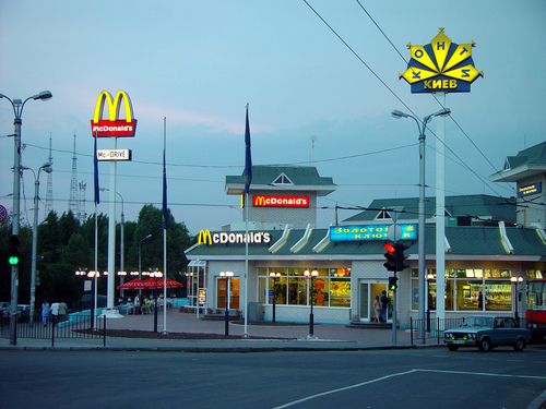 В Донецке располагаются три ресторана «Макдоналдс», которые перестали работать после провозглашения в апреле 2014 года ДНР. В настоящее время город из-за непрекращающихся боев сталкивается с нехваткой продовольствия. В течение двух месяцев жители не получают социальные выплаты, в том числе, пенсии и детские пособия.