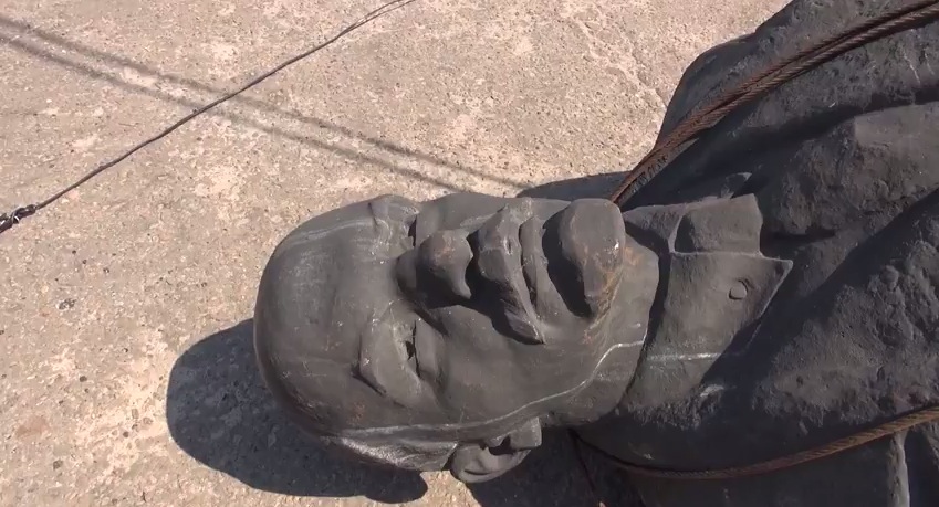 На площади, где был установлен монумент, собрались десятки активистов, чтобы на собственные глаза увидеть, как демонтируют памятник вождю тоталитаризма. Эффектное падение Ленина люди приветствовали громкими аплодисментами.